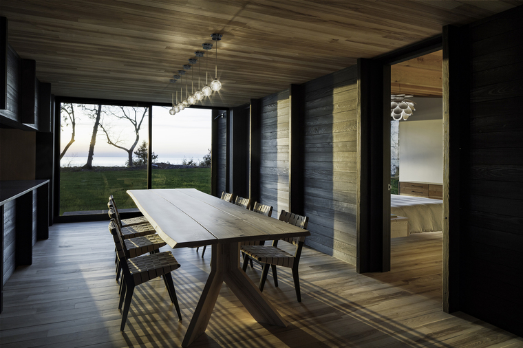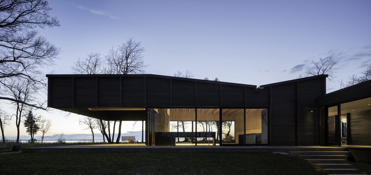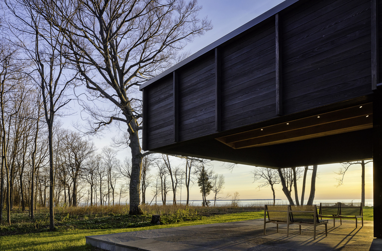 暴露在外的木梁擺放位置使得整個(gè)室內(nèi)空間里的拱頂看起來(lái)并不對(duì)稱(chēng)。在小木屋的南端,6米長(zhǎng)的懸梁屋頂延伸至觀景休息平臺(tái),屋頂為其提供了一種保護(hù),同時(shí)對(duì)密歇根湖和周?chē)拿谰耙挥[無(wú)余。