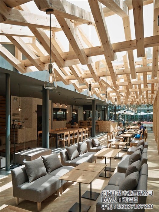 且新增的木梁在原有的鋼梁結構之間交織穿梭,形成豐富有層次的光影效果,尤其是在天氣晴好的時候,體驗感更為直接。對于空間區(qū)域的分割,設計團隊也著手從天花板部分來創(chuàng)造。比如前述提到的主要的編織木梁結構,其下方的空間寬敞明亮,更適合于那些喜愛沐浴在陽光或自然天光之下的客人們。而靠近建筑內(nèi)部的空間,在灰黑色的天花板映襯之下,則要顯得沉穩(wěn)、私密一些,顯然更適合那些需要安靜空間的客人們。