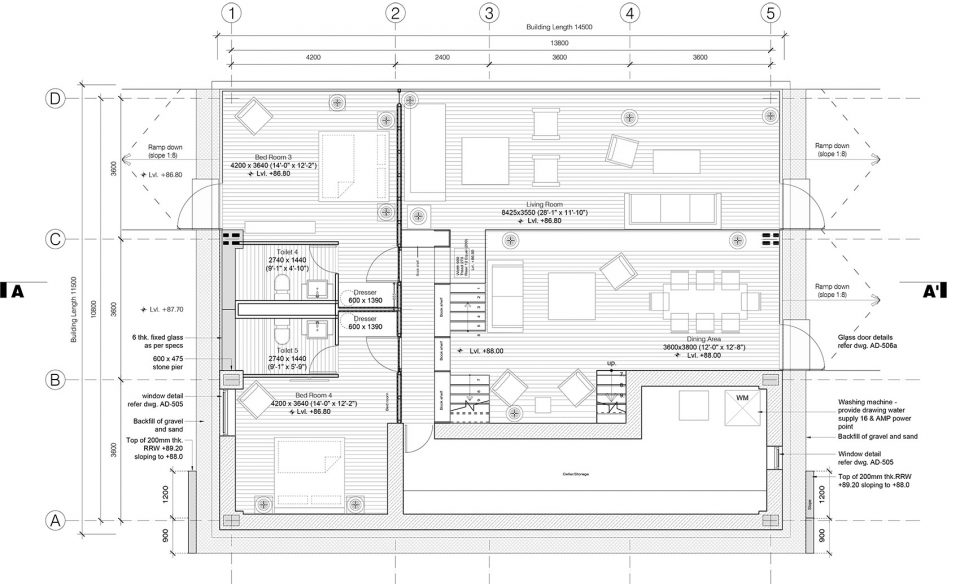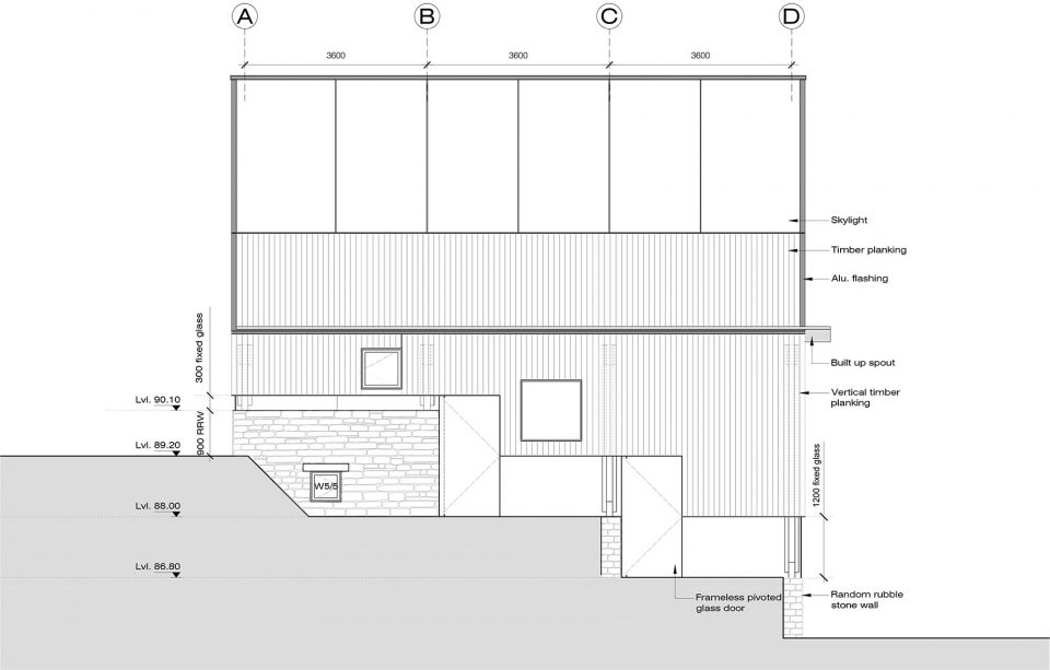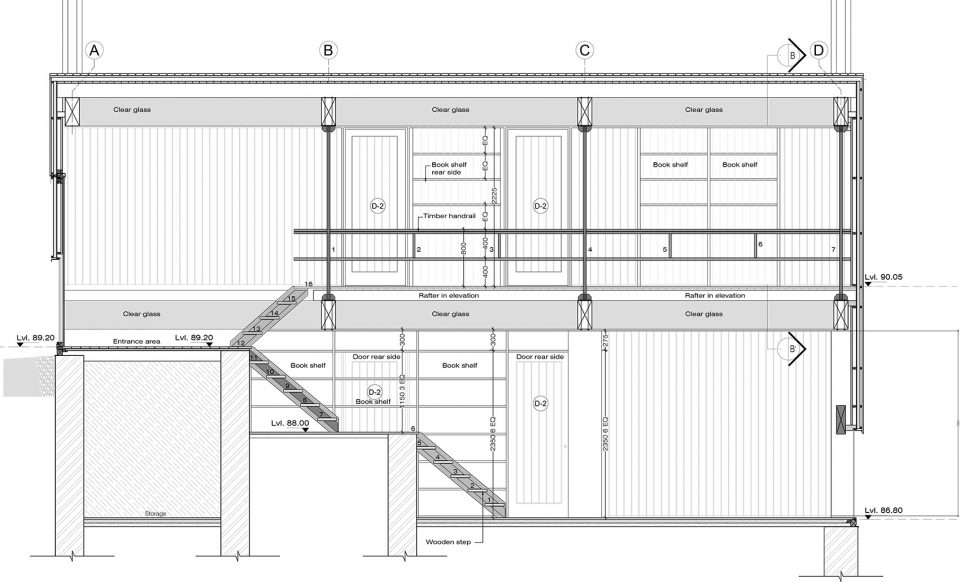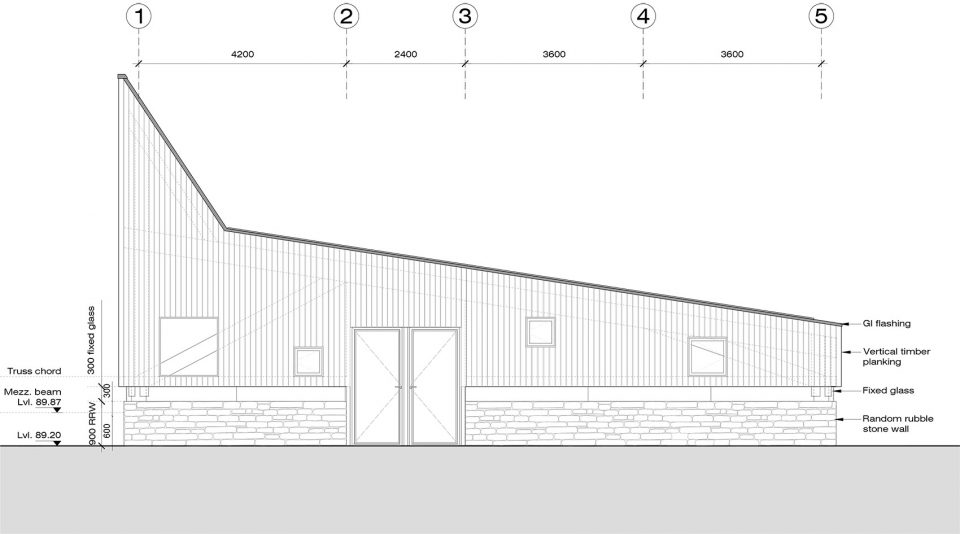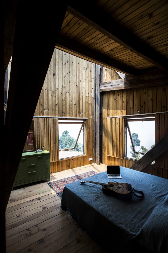 空間由三個(gè)不同的層次組成,每一個(gè)都大約占用14.5米x3.6 m的自然地形,外立面的連續(xù)橫窗使得周圍的果園和Almora鎮(zhèn)的壯觀景色一覽無余。這個(gè)開窗像是一個(gè)裂縫,成為現(xiàn)場挖出的裸露的干石墻基地和當(dāng)?shù)孛麨閠hun木材包覆之間的過渡。