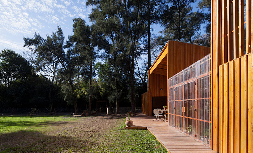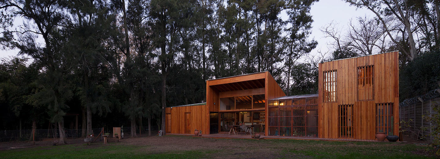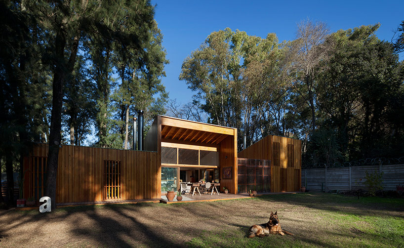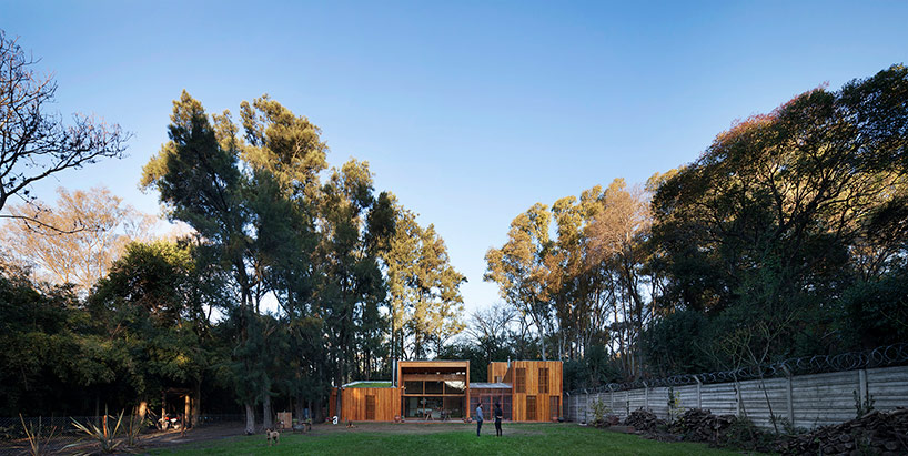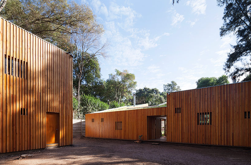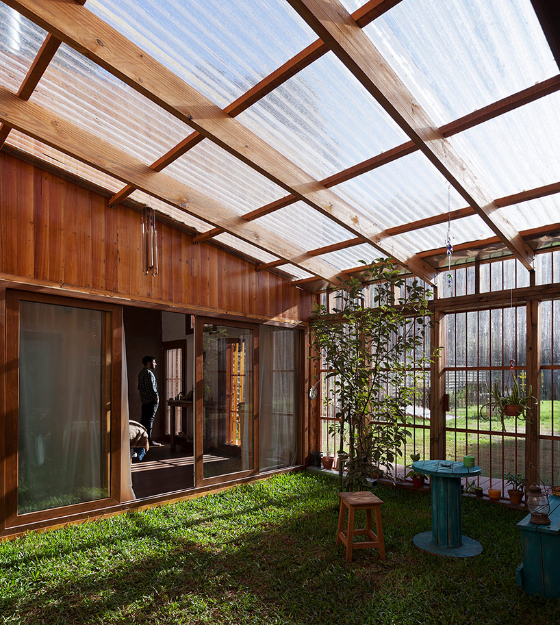 阿根廷建筑事務(wù)所IR arquitectura與我們分享的項(xiàng)目,是位于阿根廷布宜諾斯艾利斯(Buenos Aires)郊外托爾圖吉塔斯市(Tortuguitas)的 Casa Aa節(jié)能住宅。在這個(gè)養(yǎng)育著孩子的家庭住宅,家里明確地劃分出大人與小孩間的分隔,同時(shí)又融入樹木茂盛的場(chǎng)地環(huán)境中,擁有進(jìn)行室外活動(dòng)的空間和充沛的陽(yáng)光。波浪狀聚碳酸酯屋頂覆蓋下的半室外綠色庭院是個(gè)溫室和有頂花園空間,并與位于中心位置的矩形起居空間相鄰。共享的起居區(qū)和主臥擁有朝北最高的洞口,使能照射到的陽(yáng)光最大化,而建筑的外部形態(tài)因此被分割成四部分。上下交替的傾斜綠色屋頂提供了一個(gè)很好的天然熱絕緣體,還有助于替換建筑所占據(jù)的自然地被。