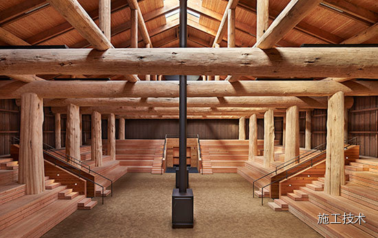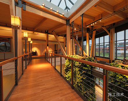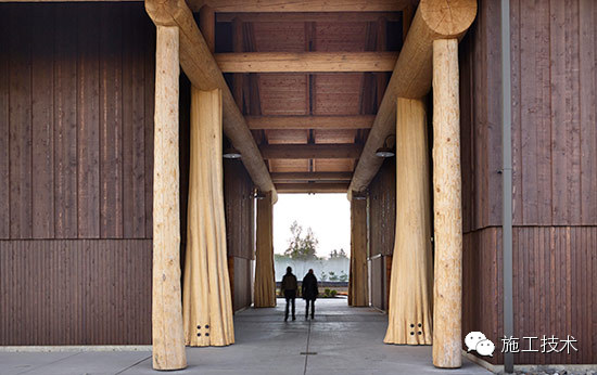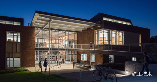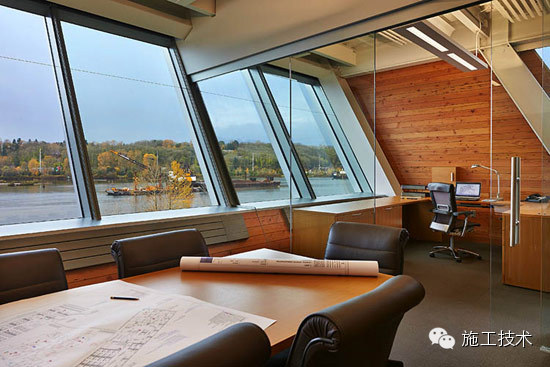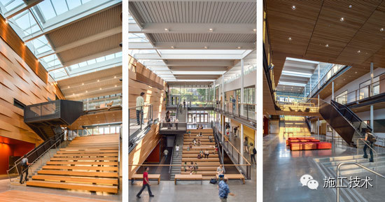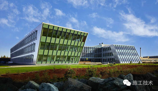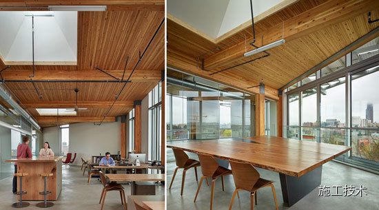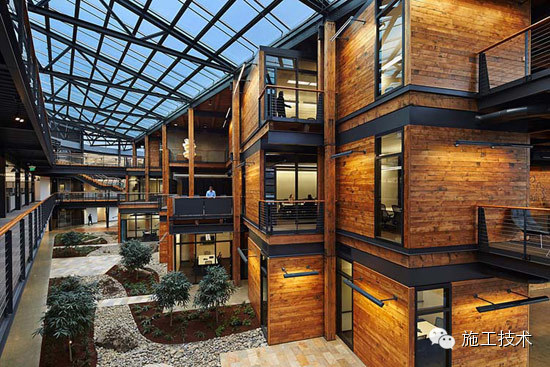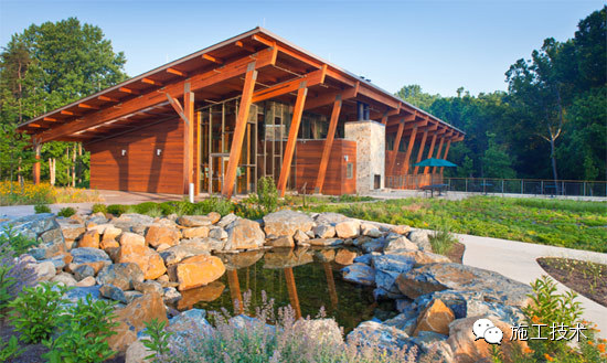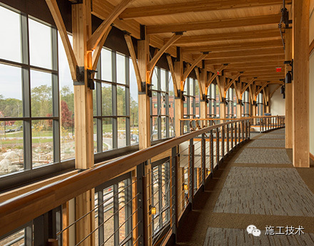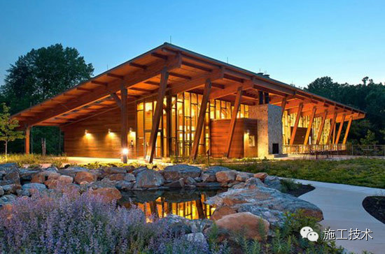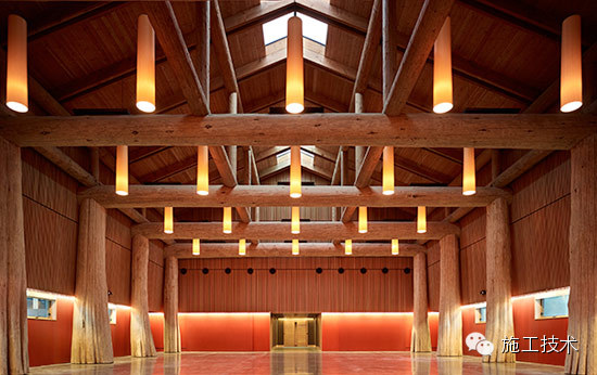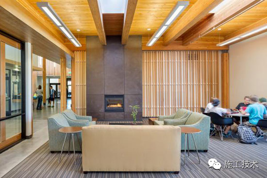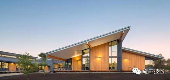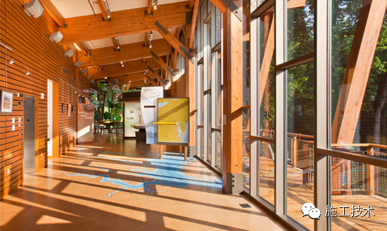 建筑物的桁架為膠合層壓板,從而優(yōu)化了這種可再生資源的結(jié)構(gòu)價(jià)值。膠合板消耗能源少于鋼筋混凝土或鋼材,可用于更長(zhǎng)的時(shí)間跨度,可承受重負(fù)荷,并且擁有復(fù)雜 的形狀。該建筑通過(guò)了LEED環(huán)境保護(hù)認(rèn)證,包括一套可再生的膠合板結(jié)構(gòu)系、節(jié)水管道夾具、利用可回收的當(dāng)?shù)夭牧?、室?nèi)擁有豐富的自然光線(xiàn)以及高效的機(jī)械 系統(tǒng)、照明和外表皮。