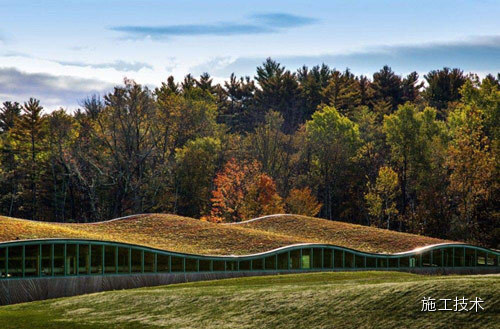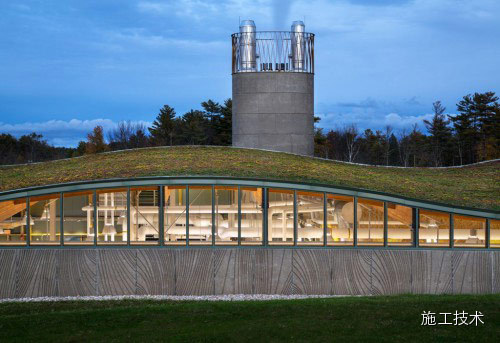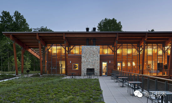 這個(gè)總面積達(dá)16500平方英尺的建筑屋頂由植被覆蓋而成,與周?chē)参锏念伾恢拢欣诮ㄖ锱c自然風(fēng)光相互協(xié)調(diào)。從某些角度,建筑幾乎消失于人們的視野 之中。當(dāng)?shù)刎S富的可再生建筑材料在整個(gè)建筑框架、桁架、欄桿、單板和木材復(fù)合板中都得到了充分應(yīng)用。欄桿是在當(dāng)?shù)厥崭睢⒀心?、烘干后進(jìn)行再裝配的。