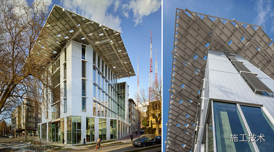 該建筑通過(guò)各種不同的系統(tǒng)達(dá)到以下這些目標(biāo),如一個(gè)高性能的建筑圍護(hù)結(jié)構(gòu);一個(gè)旨在優(yōu)化自然光的布局,估計(jì)有82%的中心空間將利用自然光采光。仔細(xì)與租戶(hù) 協(xié)調(diào),通過(guò)使用高效率的顯示器、復(fù)印機(jī)、筆記本電腦、零客戶(hù)端和基于云的服務(wù)器,以減少他們約75%的“插頭負(fù)載”。26孔、400英尺深的地源熱泵空調(diào) 系統(tǒng),將從地球收獲的能源來(lái)提供高效的加熱和冷卻,地板輻射系統(tǒng)將有效地加熱和冷卻辦公空間。242千瓦的屋頂太陽(yáng)能光伏陣列將提供建設(shè)所需的所有凈能量。