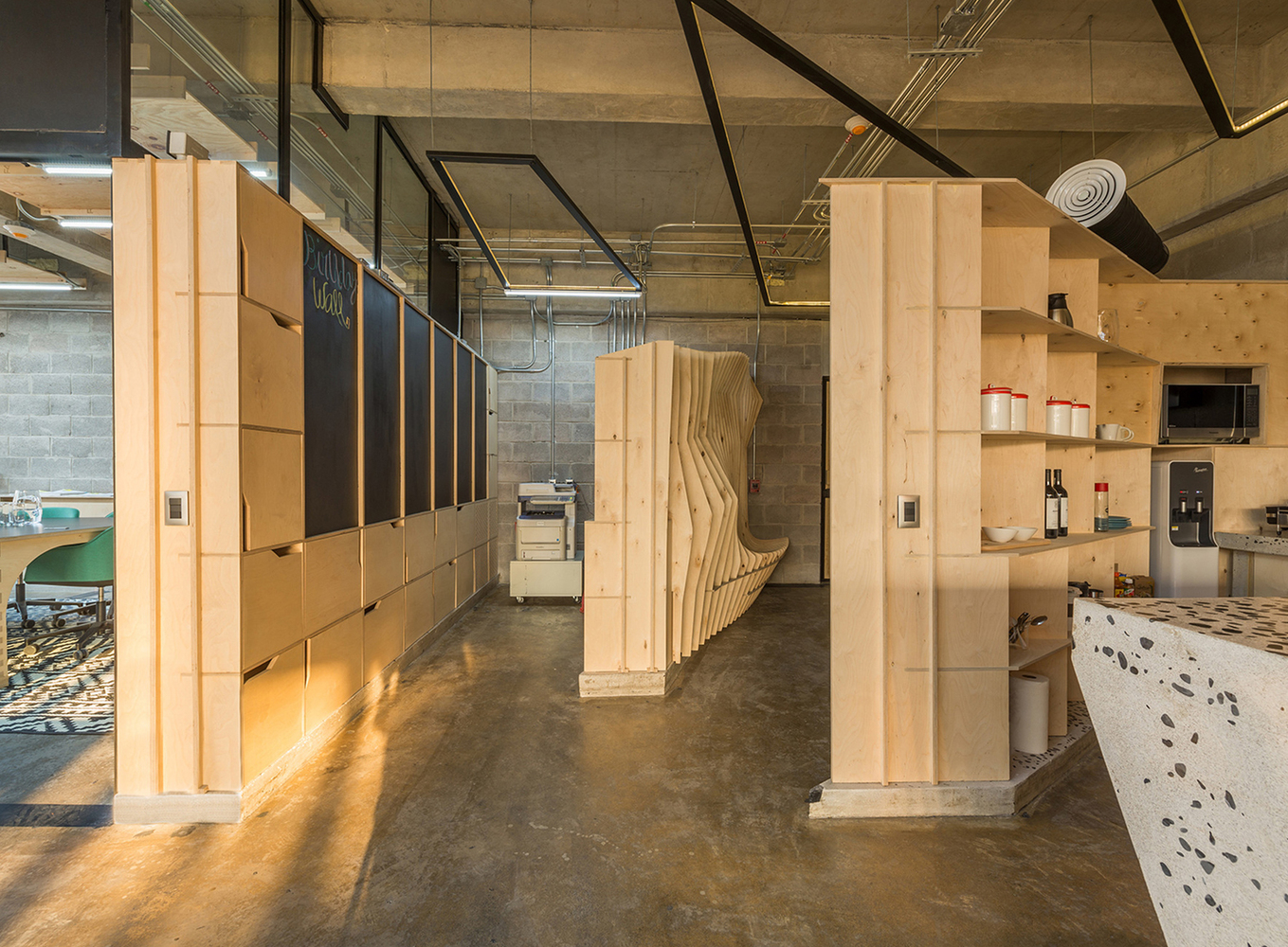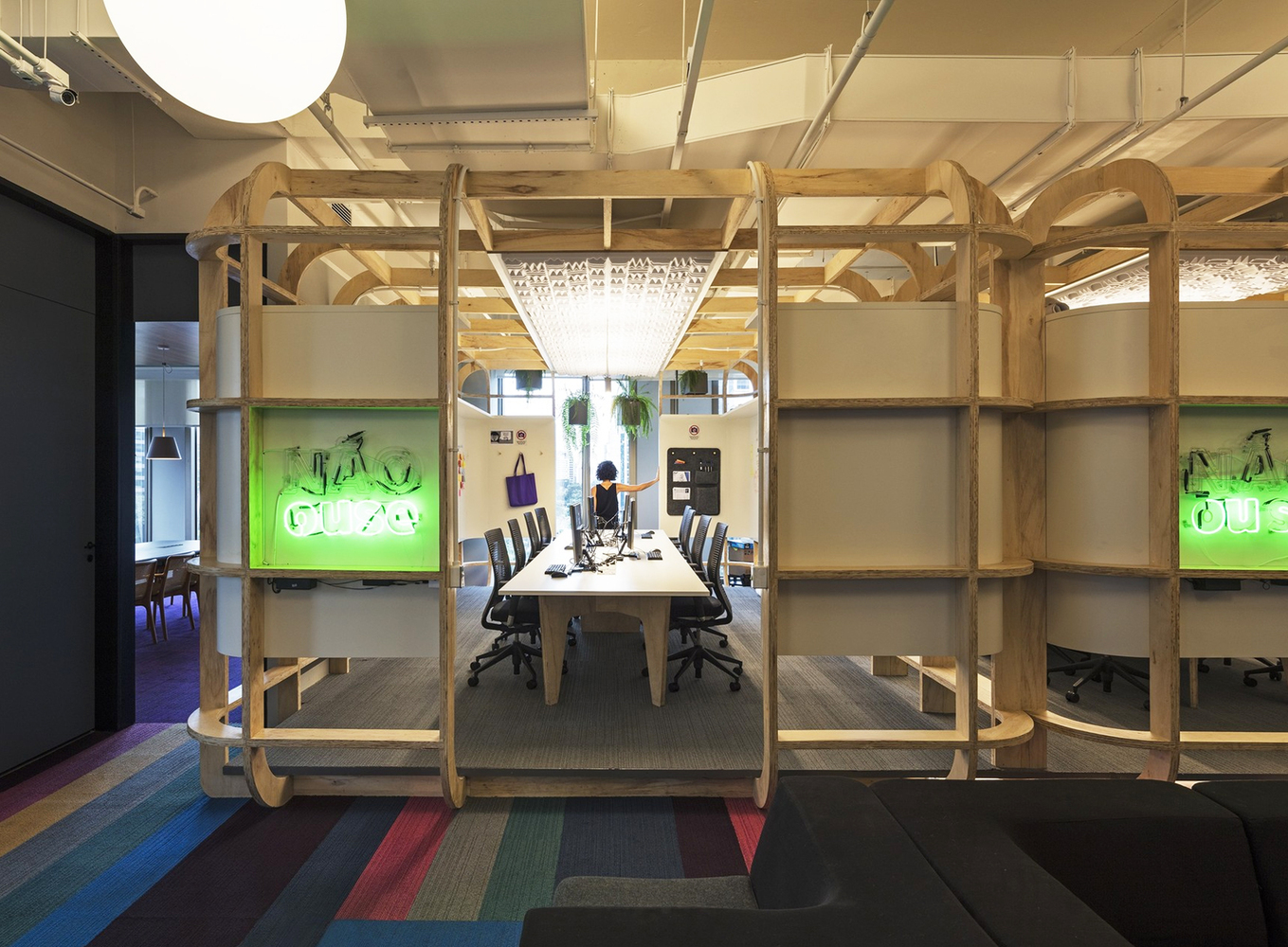 “Youse 的木工靈感來自晶圓廠實(shí)驗(yàn)室,體現(xiàn)了 CNC 海軍膠合板的原材料。景觀設(shè)計(jì)在視覺上溫暖了整個空間,提升了工作環(huán)境的品質(zhì)。各個單元專門為多學(xué)科團(tuán)隊(duì)分組以進(jìn)行特殊項(xiàng)目而設(shè)計(jì)。這些空間是半開放式系統(tǒng),最多可容納 12 人,保證團(tuán)隊(duì)隱私,同時(shí)也可由此進(jìn)入休息區(qū)。”