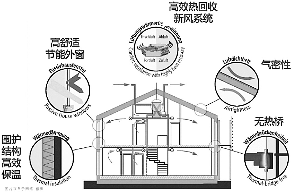 超低能耗建筑健康和舒適指的是溫度、濕度、光線、風(fēng)速、室內(nèi)聲音、潔凈度和空氣健康。健康和舒適是兩個概念。就像一個人因為熱把空調(diào)調(diào)到極低的溫度,或者把電風(fēng)扇調(diào)到最大的風(fēng),表面上他獲得了片刻的舒適,但他失去了健康。因此,健康和舒適必須分開提出,作為被動式房間的特征。在節(jié)能方面,被動式住宅技術(shù)是實現(xiàn)能源消耗接近零的技術(shù)體系。通過大幅度提高圍護結(jié)構(gòu)的熱工性能和氣密性,采用高效的新風(fēng)熱回收技術(shù),使建筑采暖需求降低到15 kWh/(m²·a)以下。最節(jié)能的被動式超低能耗建筑,節(jié)能可達90%以上。