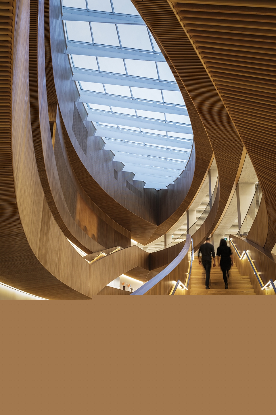 底層的外立面并未使用透明的六邊形,而是設計成了凹進去的寬闊木質拱頂,人們在進入圖書館的時候會產生被環(huán)抱的感覺。圖書館入口處結構參考了當地常見的Chinook云拱。入口處的雙曲面木質拱廊是世界上最大的自由曲面木質外殼之一,材質選用了不列顛哥倫比亞省西部產的紅杉木。其有機形態(tài)和質感讓大型建筑的尺度變得親密。從圖書館外面就能看到中庭,仿佛在邀請人們進入。