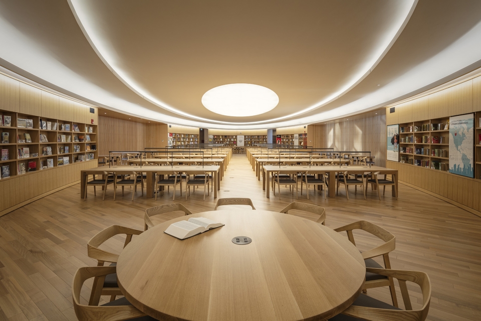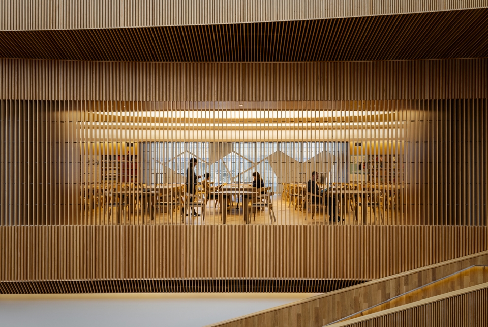 圖書館共有六層,分布著各種空間,比如數字空間,模擬空間,群體空間以及個人互動空間。圖書館頂層是大閱覽室,建筑師在設計時,把它構想成藏在圖書館的珠寶盒,人們可以在這兒潛心研究,尋找靈感。進入大閱覽室之前要先經過一個過渡空間,過渡空間光線柔和,聲效優(yōu)良。室內利用木質格柵而非實體墻壁來環(huán)繞空間,這樣既保證了隱私,又有一定的可見度。陽光透過木條的縫隙照亮了中庭和西立面之間的空間。