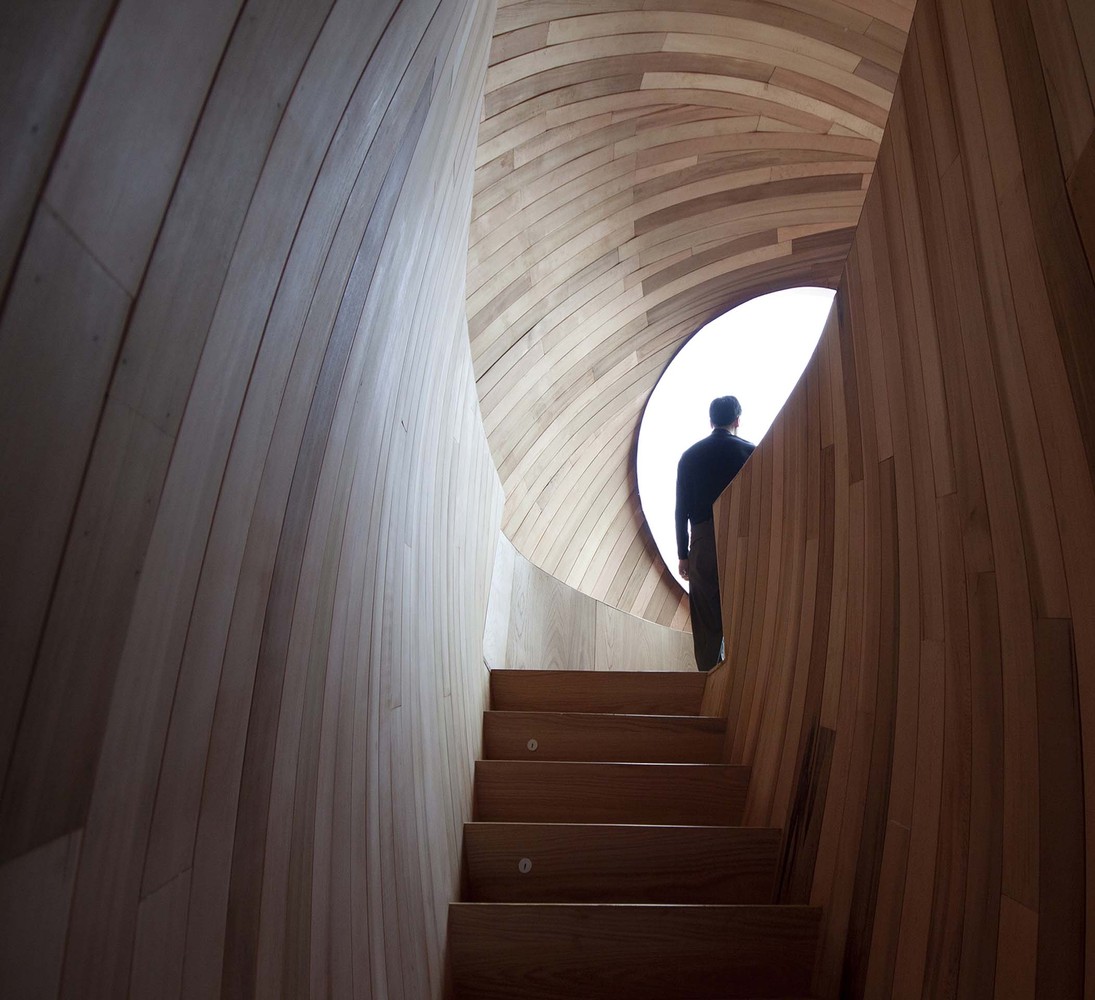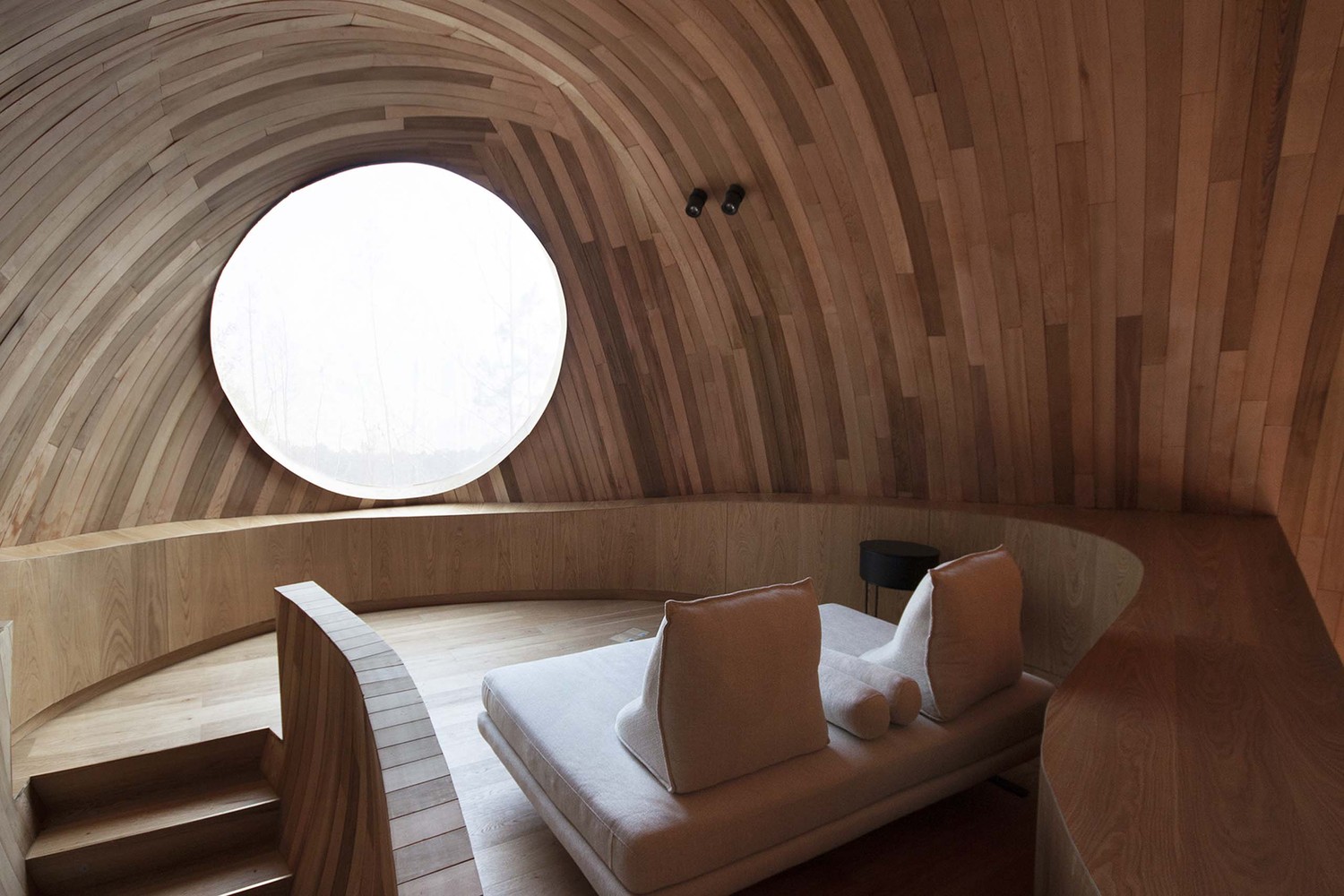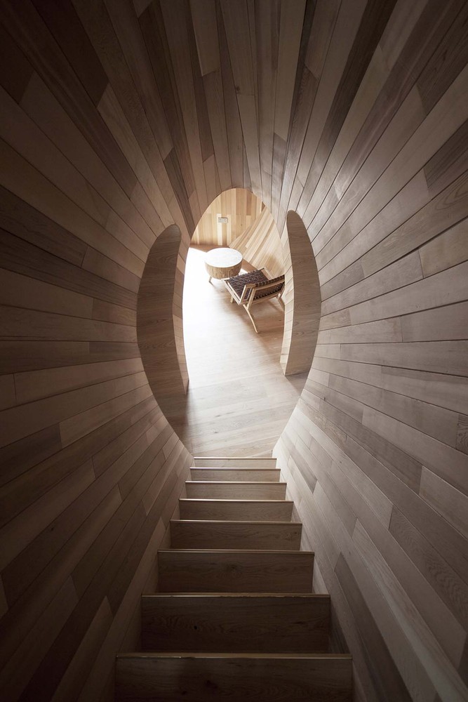 種子屋室內(nèi)墻面采用統(tǒng)一的木拼,自然的木色變化形成的條紋感,進一步強調(diào)橢球形態(tài)的空間感。主臥后側(cè)體量容納入口、衛(wèi)浴、儲藏等功能區(qū),同時形成親子區(qū)閣樓。閣樓與一層通過一個插入式的橢圓柱型樓梯間連接,同時樓梯間與入口空間穿插,形成有趣的異形空間。