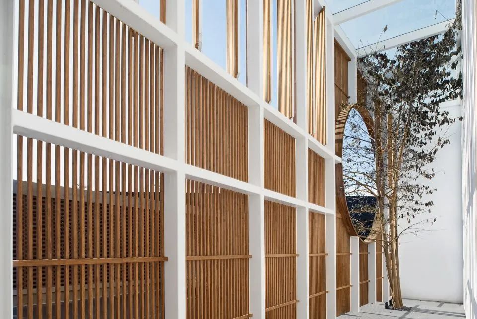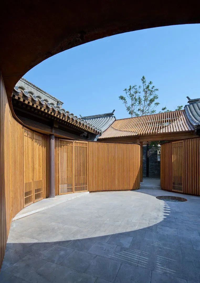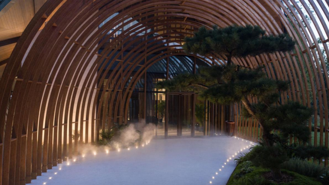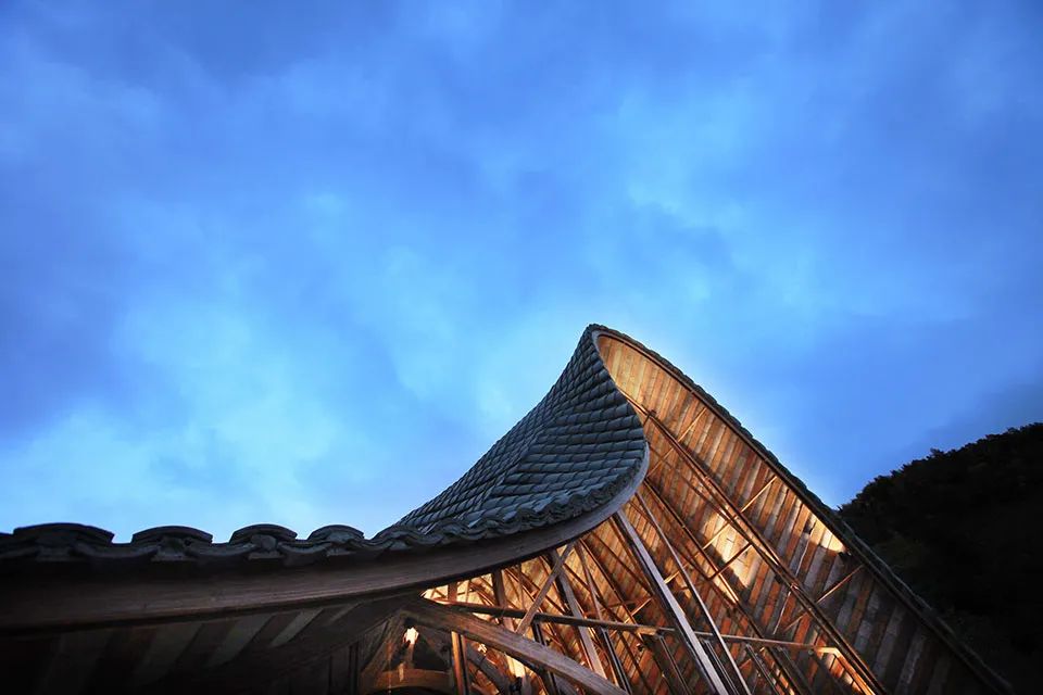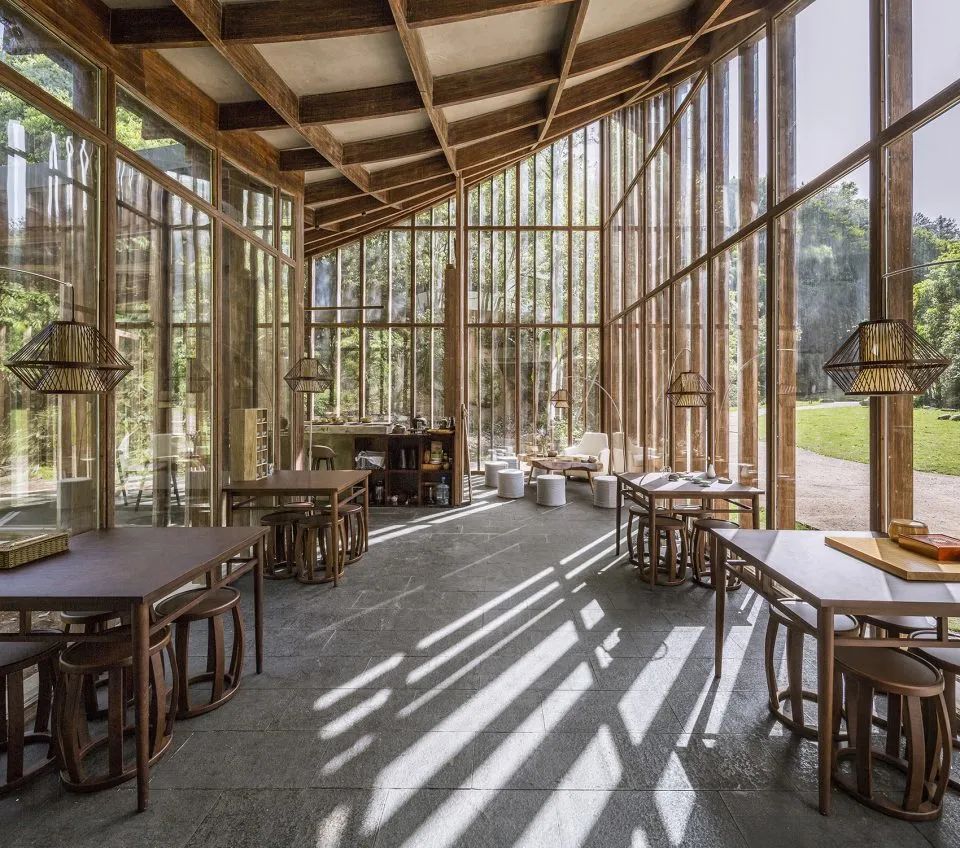 曲面屋頂聯(lián)系起整個(gè)建筑群落,豎向的桿件結(jié)合曲面屋面,組成自由、輕盈的建筑形態(tài),取材延續(xù)中國古建筑的質(zhì)樸自然,借助青瓦、鋼木等,打造建筑的原始與本真,釋放出閑適愜意的空間氛圍。