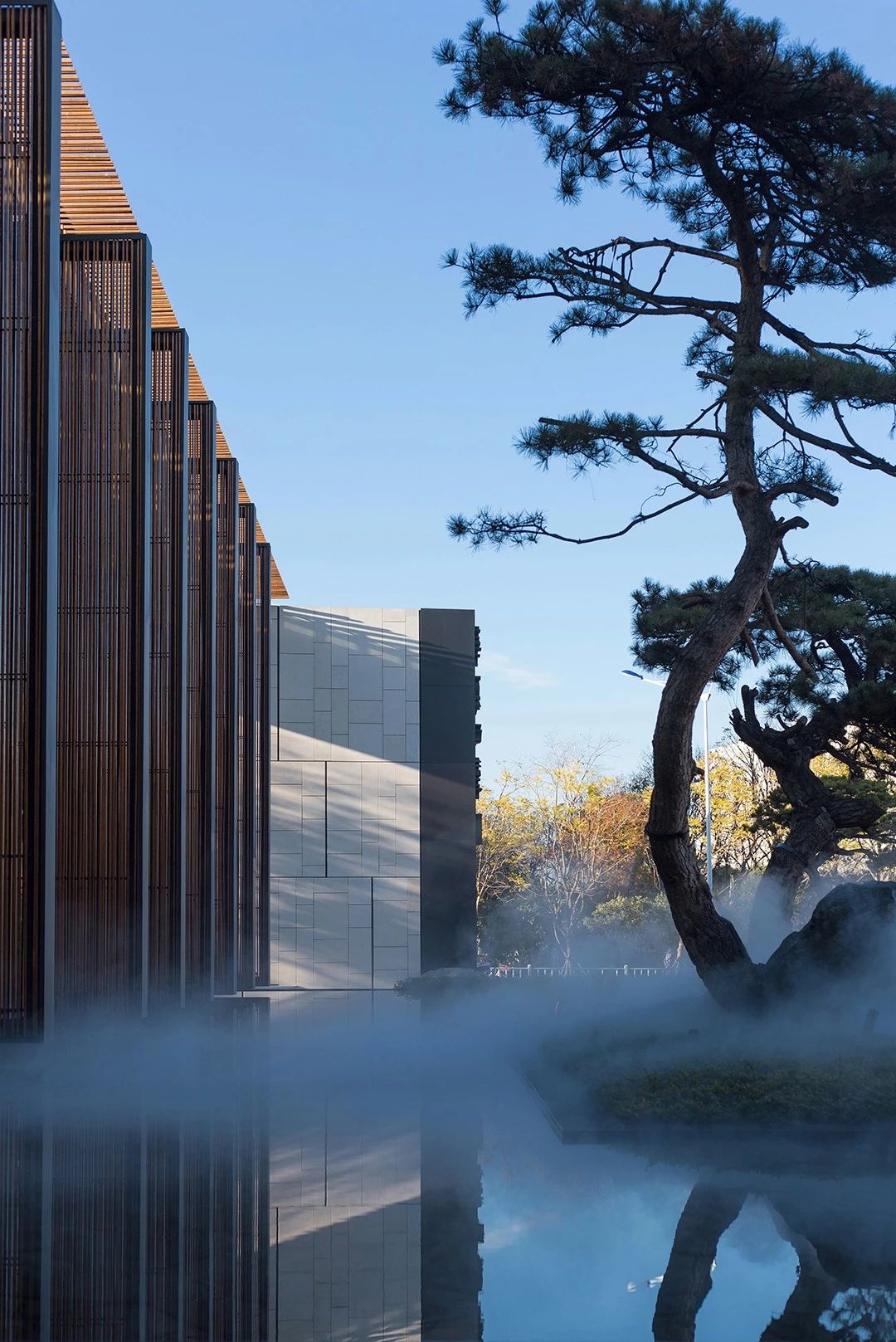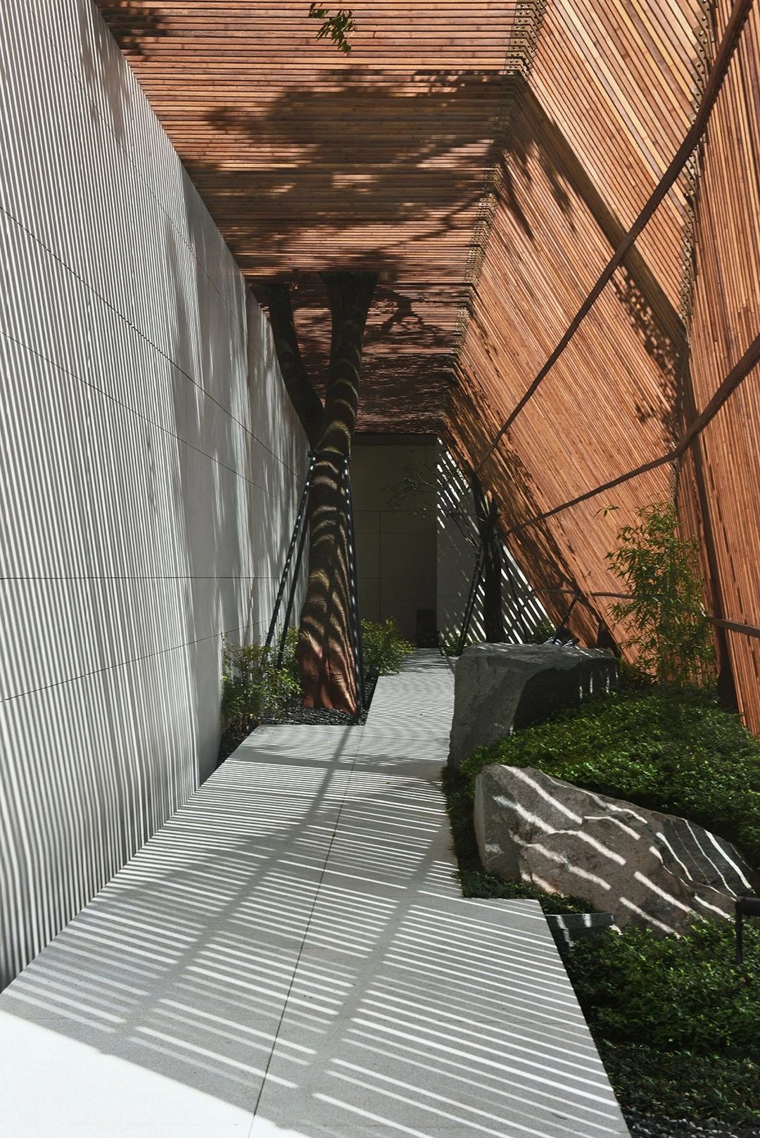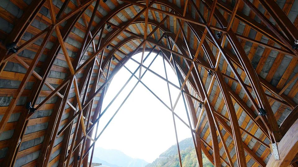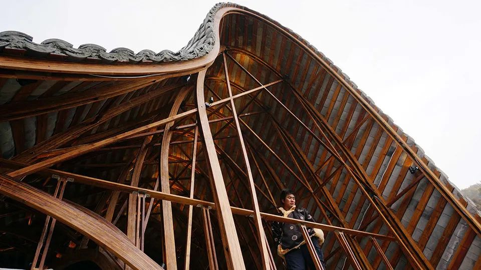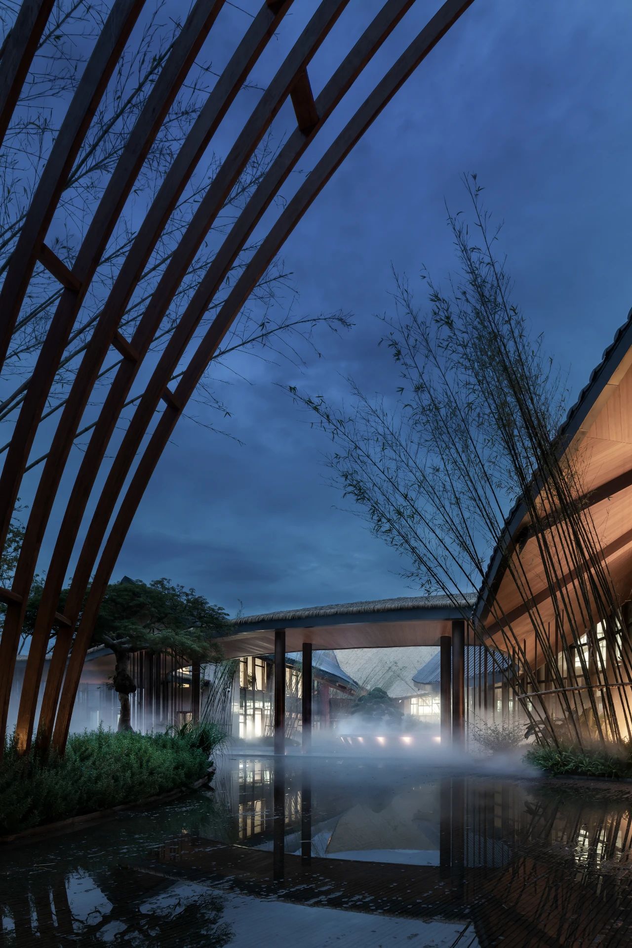 曲面屋頂聯(lián)系起整個(gè)建筑群落,豎向的桿件結(jié)合曲面屋面,組成自由、輕盈的建筑形態(tài),取材延續(xù)中國古建筑的質(zhì)樸自然,借助青瓦、鋼木等,打造建筑的原始與本真,釋放出閑適愜意的空間氛圍。