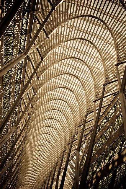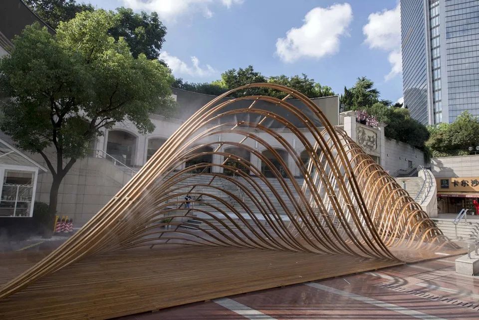 為了達(dá)到更輕薄的形體效果,建筑主體采用竹鋼搭建,豎向的立柱每根都為承重住,從而達(dá)到均勻受力的效果。“柱”與“梁”的連接部分采用簡(jiǎn)單的交錯(cuò)堆疊起來進(jìn)行構(gòu)造的方法,使其在形式上產(chǎn)生出類似斗拱結(jié)構(gòu)的效果。