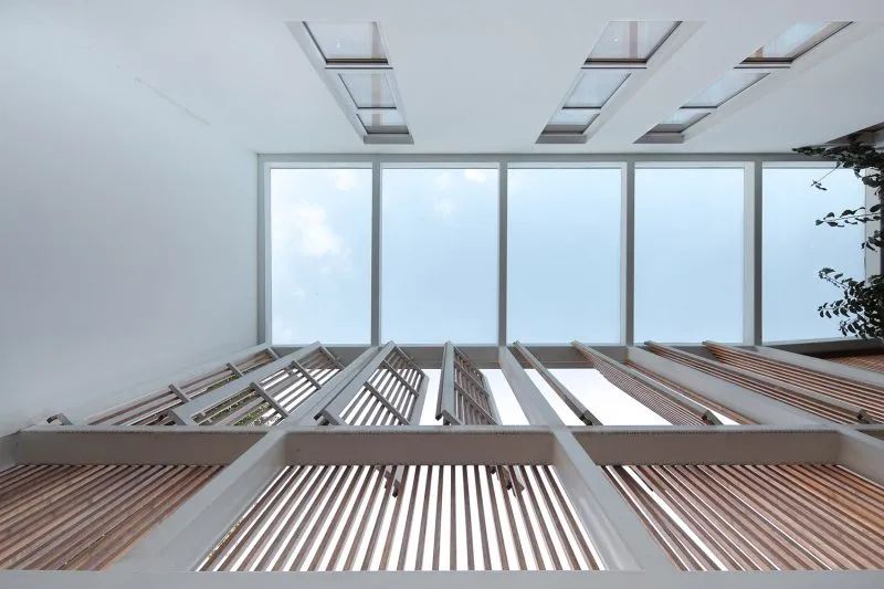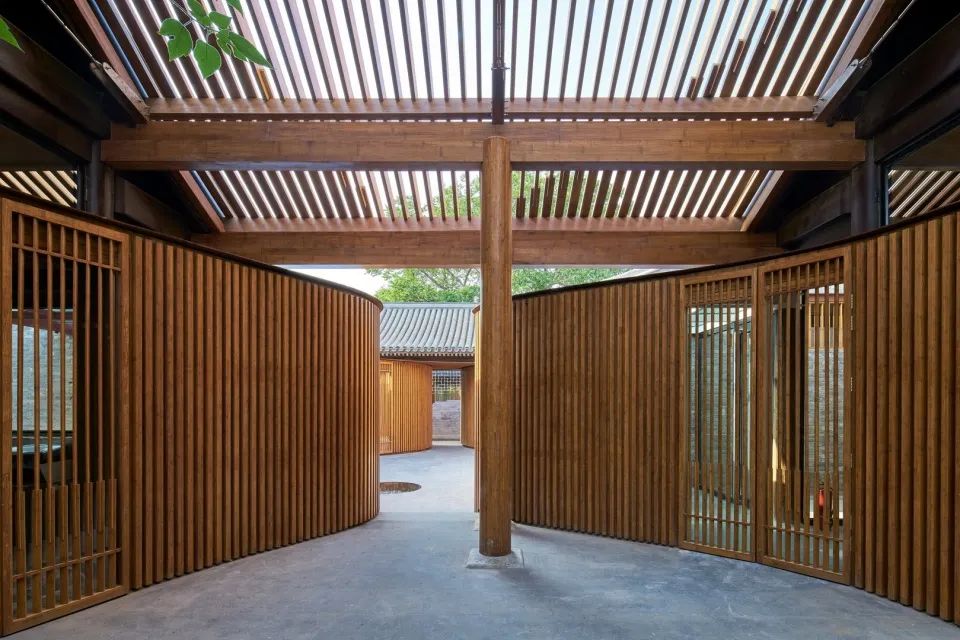 屋頂用原先木架尺寸的竹鋼梁架搭接,椽子采用十字交叉竹鋼構(gòu)件組合,在小院的正上方勾勒出葫蘆形的輪廓,通透的竹鋼板屋面一方面呼應(yīng)了原有屋瓦的尺度,又形成屋面中間更為通透的效果,給屋中小院引入充足的陽光,便于樹木生長(zhǎng)。