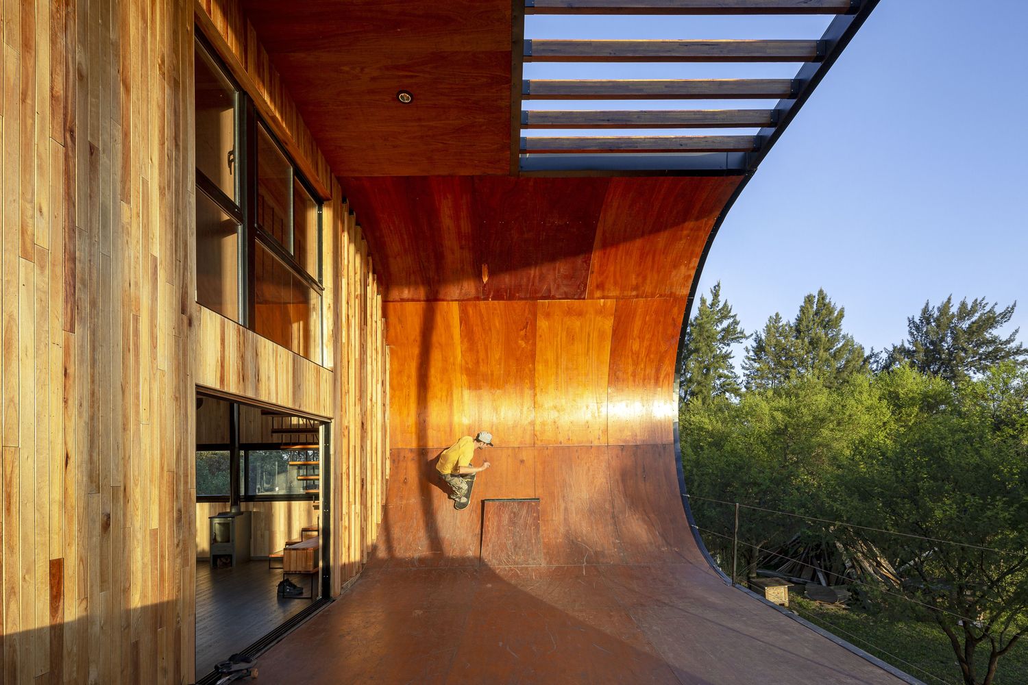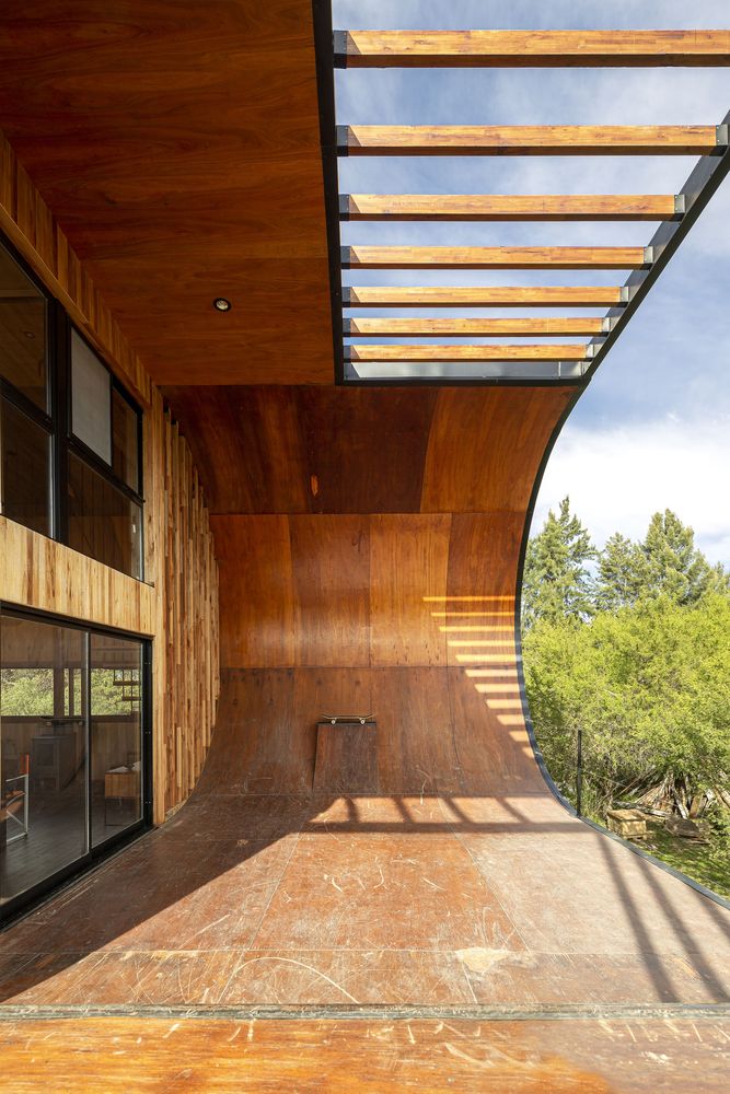 這是一個100%可持續(xù)的住宅,同時業(yè)主也可以在上面滑滑板。業(yè)主是一名滑板者,希望房子本身附帶一個滑板場地。設(shè)計(jì)師將室外陽臺設(shè)計(jì)成滑道,并在向南一側(cè)設(shè)置一面墻,在住宅東南角形成一個向上的弧形用于減速。這面墻延伸到了屋檐處,起到阻擋夏天烈日的作用。