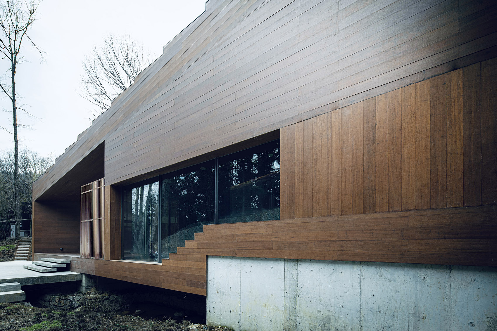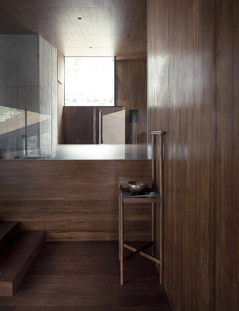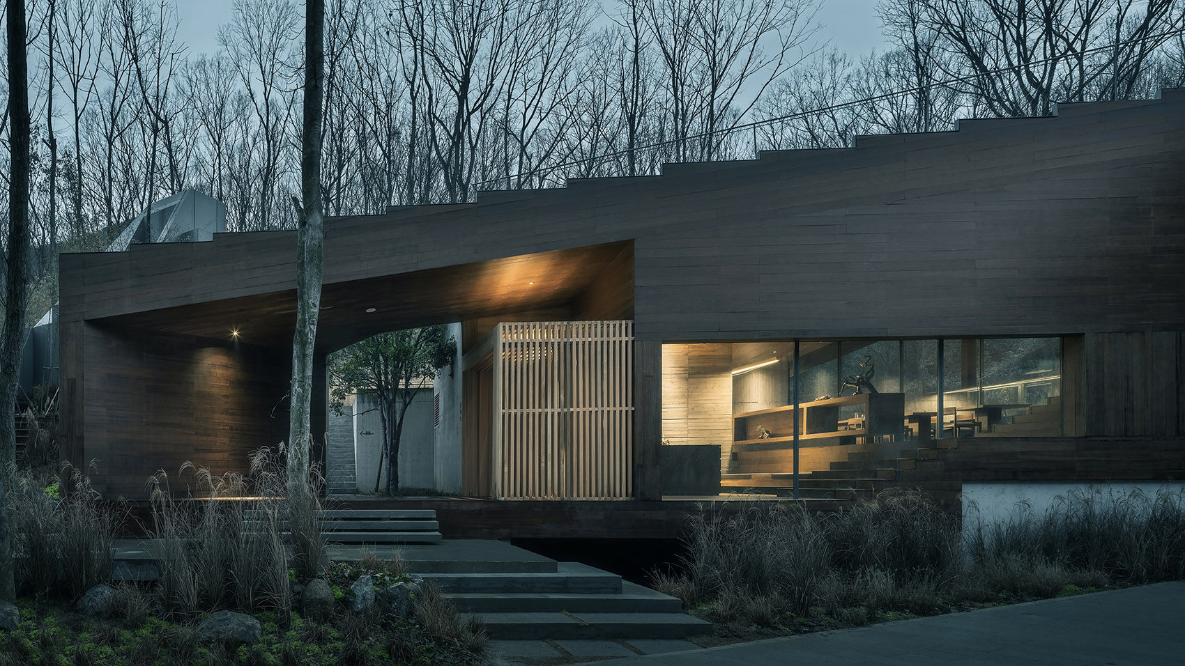 這是在杭州郊區(qū)山林里的一個休閑度假服務空間,設計是從具體的環(huán)境開始的,我們首先要思考的是做一個什么樣的空間裝置可以和這片山林對話,可以更好的順應地形并融入這片自然,場地的特殊條件決定了建筑的特殊性。