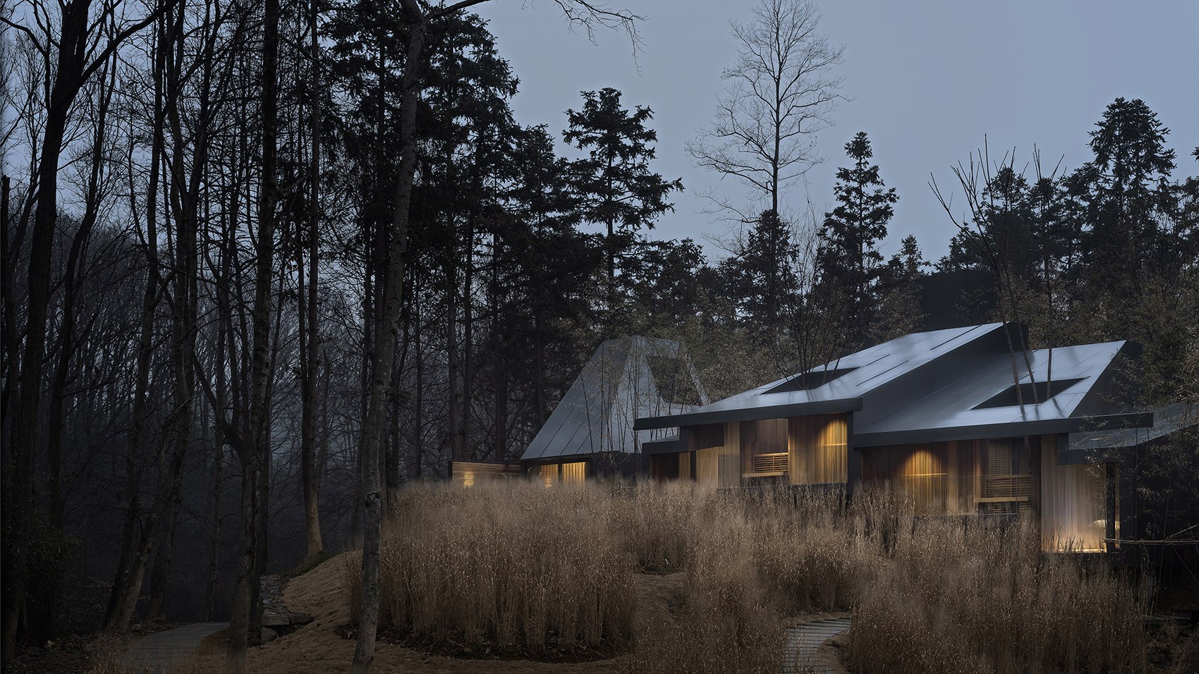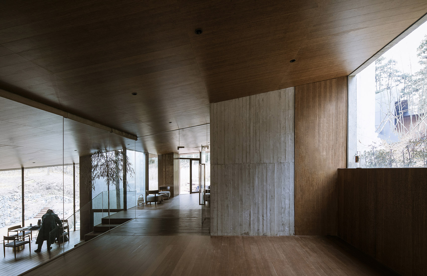 建筑的另外兩側分別嵌入山體之中,架空的蝶狀建筑的下方仍然保留了溪水和山路的通道。為了將部分樹木保留在室內,豎向結構被設計成“柱院”,結構意義上是柱子,空間意義上,是保留了一棵樹的“微院”。屋面是一個臺階狀的坡屋頂,可作為小型演出的森林劇場,室內空間被這個大坡屋頂統(tǒng)一起來,并因為不同地面標高的變化而富有節(jié)奏。