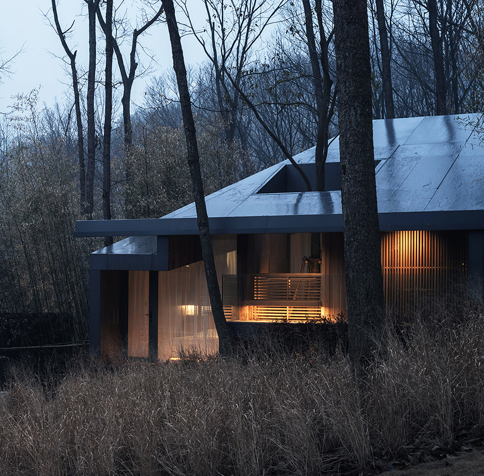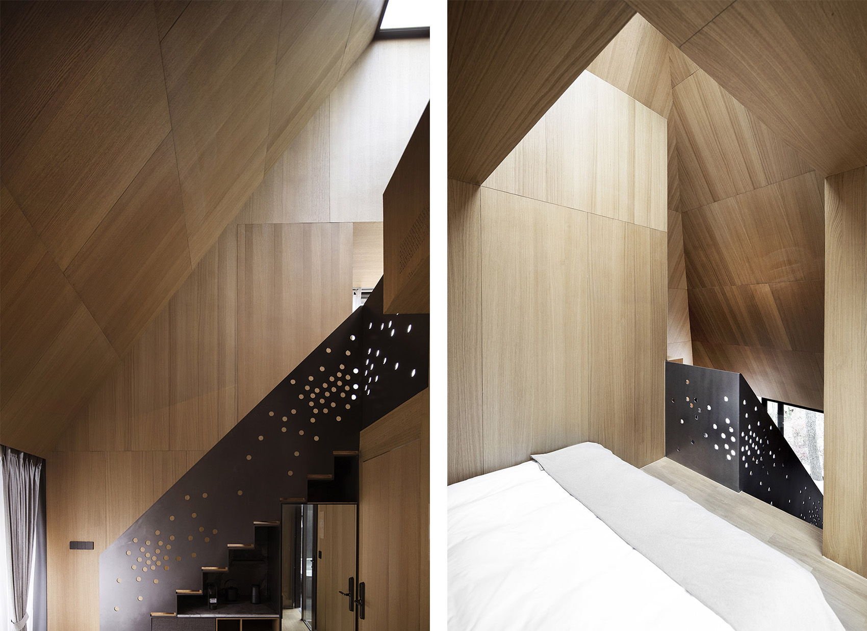 每個小屋中都保留了一棵場地原生的樹木,樹木所占據(jù)的空間成了屋中院,透過玻璃時刻于室內生活相伴,是自然向建筑的反向滲透,屋中院也為室內衛(wèi)生間提供了具有私密性的風景。