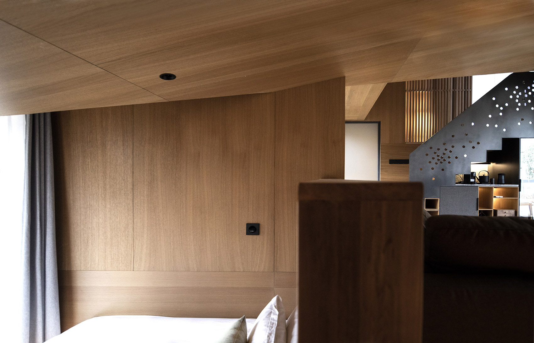 空間的大小是以人的基本尺度來定義的,建筑的墻面和屋頂都觸手可及,這種微小的尺度讓人時刻感受到建筑處于自然之中。這種接近于野營帳篷的空間體驗,希望讓人時刻感受到自然就近在咫尺,只是隔了一層外墻的厚度。通體的木質材料提供了溫暖而舒適的建筑內襯,給人提供了舒適而愜意的生活氛圍,這和外部自然的野趣形成的強烈的反差,這種反差讓人對自然保持敏感,更能感受到自然之美,或溫柔細膩,或爆裂冷峻。
