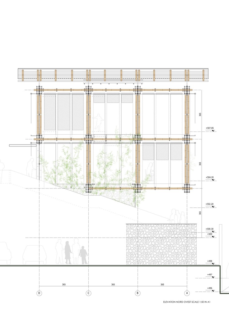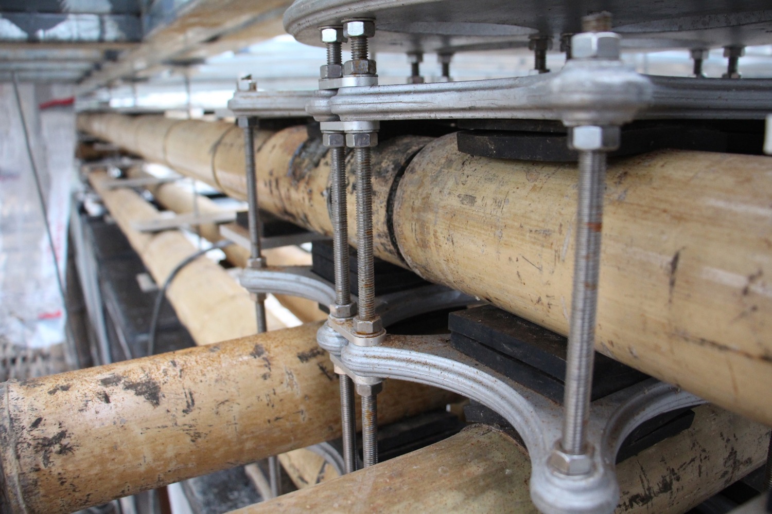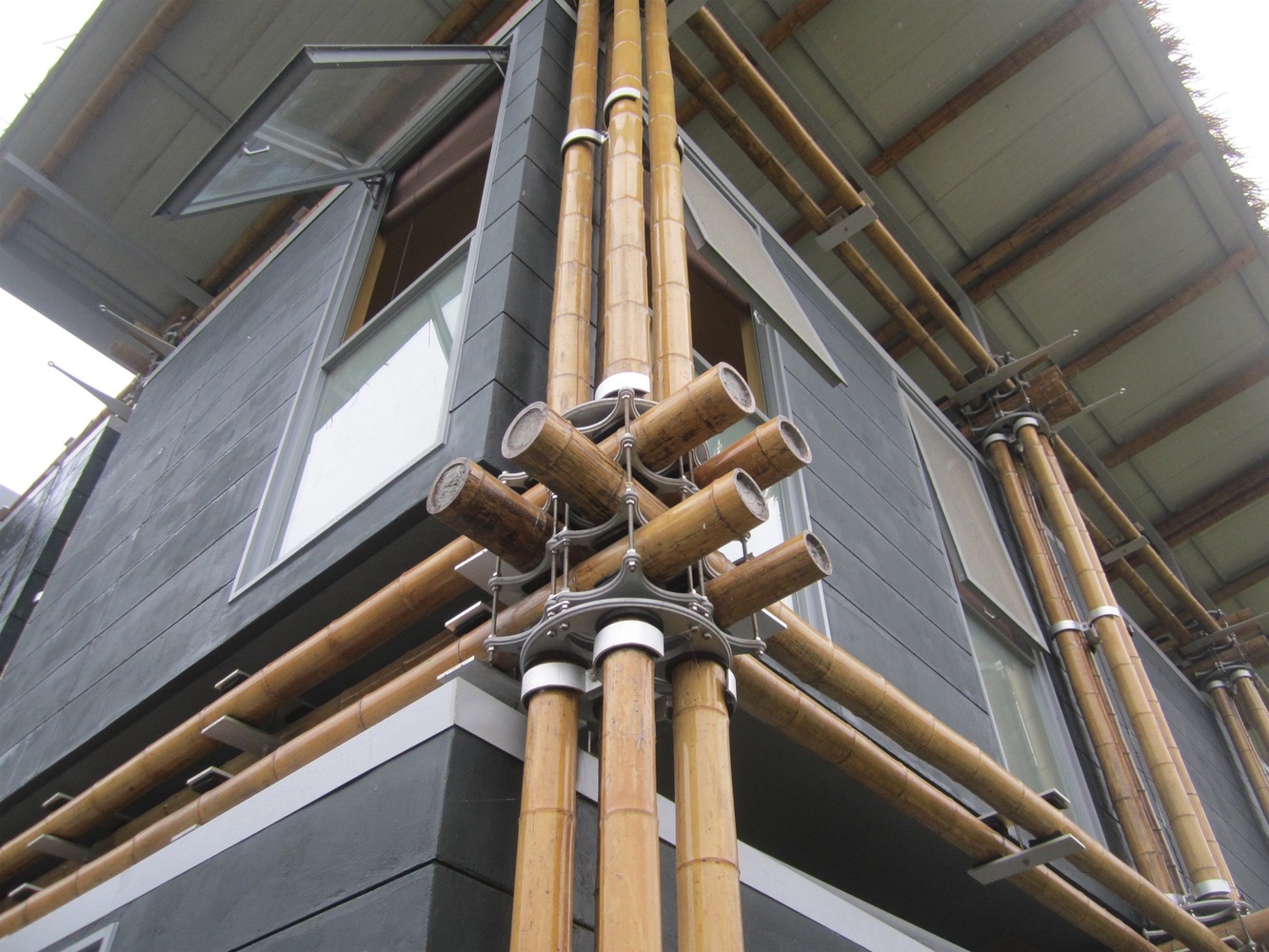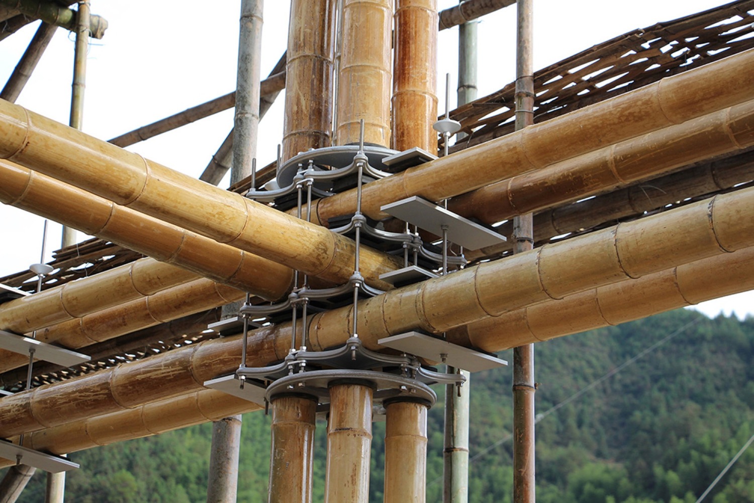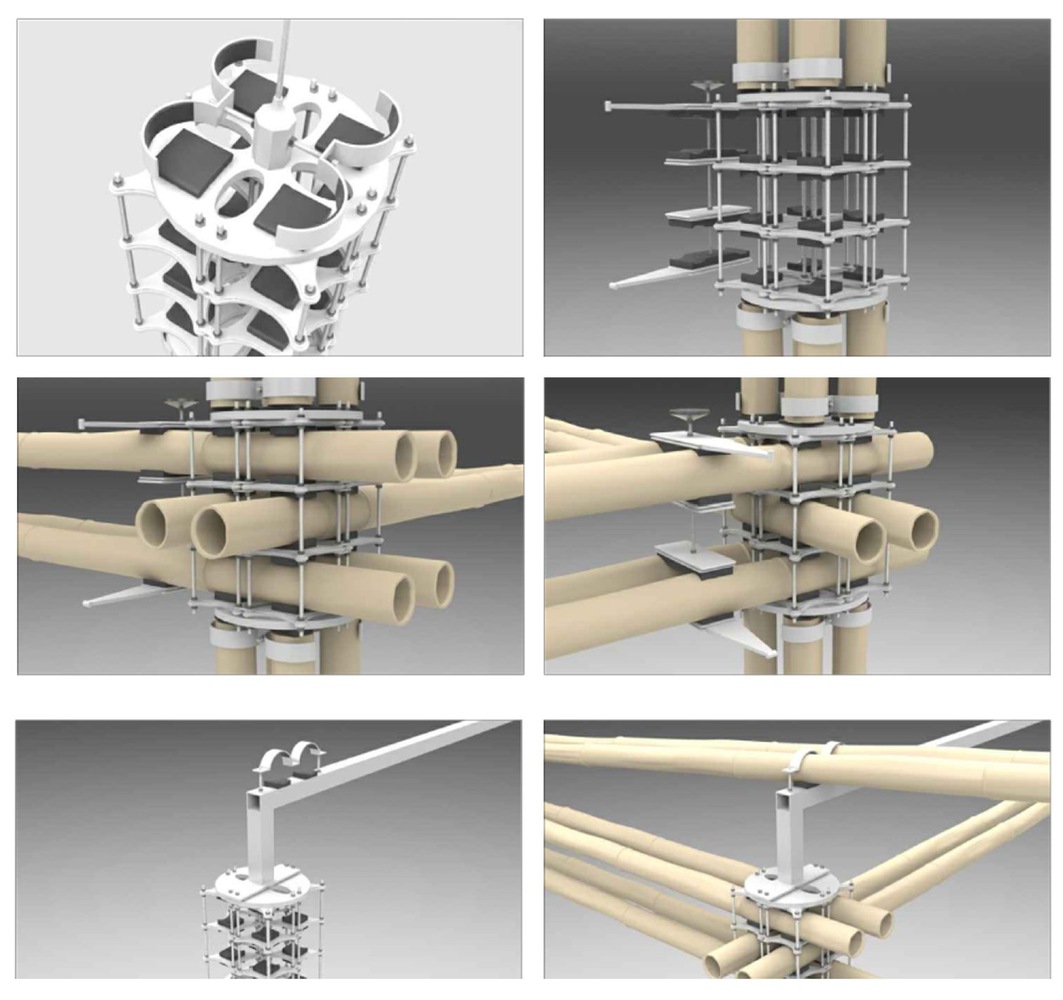 設計干式連接,不要通過穿孔削弱竹子,也不要用混凝土填充竹子,還可以根據(jù)需要更換竹桿;