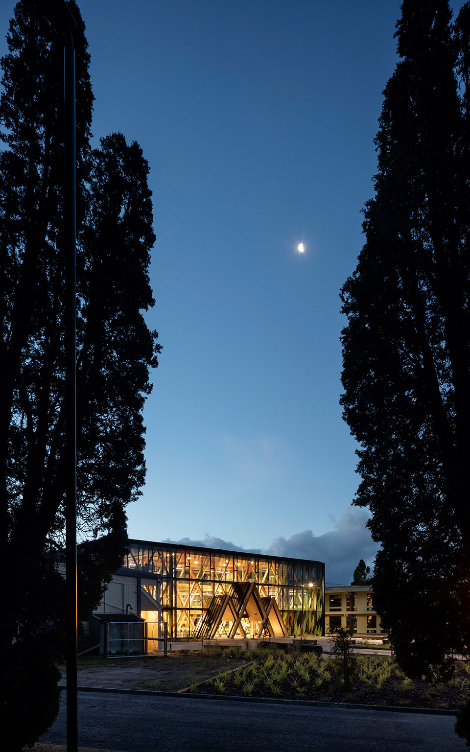 “Te Whare Nui o Tuteata”研究中心邀請(qǐng)研究人員、木材行業(yè)從業(yè)者,以及社區(qū)大眾來共同領(lǐng)略木材研究創(chuàng)新的價(jià)值,力求將自身與研究中心的理念化作未來發(fā)展的一部分。該建筑不僅僅為大眾展示出一個(gè)真實(shí)的木結(jié)構(gòu)建筑原型,同時(shí)預(yù)示了更多未來木結(jié)構(gòu)建筑的可能性,堪稱新西蘭實(shí)現(xiàn)2050年零碳排放道路上的里程碑。設(shè)計(jì)團(tuán)隊(duì)希望每個(gè)人都能夠參與到這場冒險(xiǎn)中,通過可持續(xù)地利用木材資源,提高人們對(duì)生態(tài)的責(zé)任感與參與度,正如上文中所號(hào)召的那樣“走進(jìn)我們共同的森林”。該建筑被命名為“Te Whare Nui o Tuteata”,由Ngā Hapū e Toru贈(zèng)與,傳承了tupuna Tuteata的精神,與當(dāng)?shù)孛幕椭苓叚h(huán)境緊密相連。