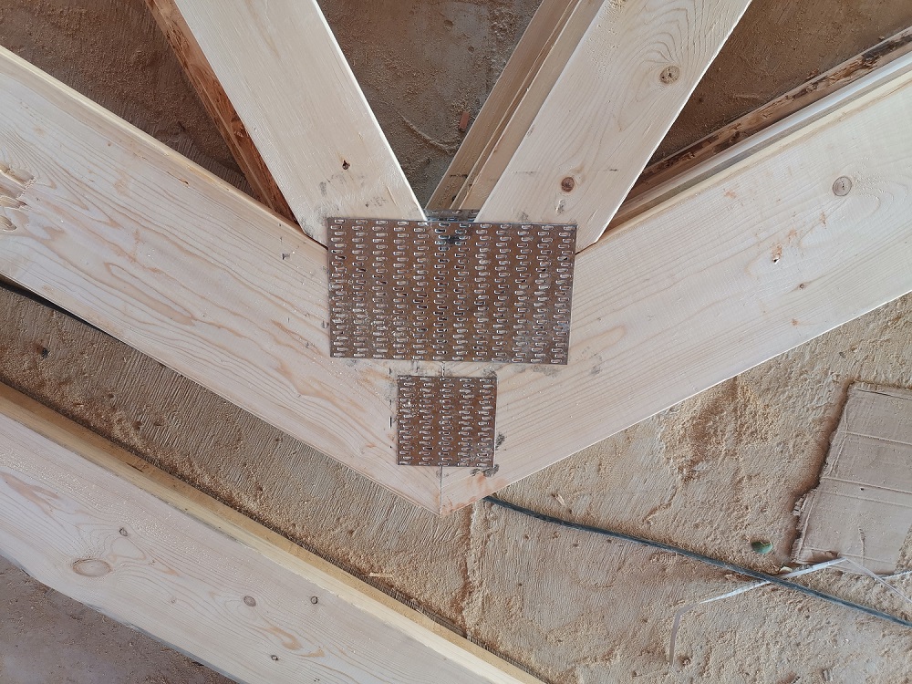 齒板連接主要用于輕型木結(jié)構(gòu)建筑中規(guī)格材制成的輕型木桁架節(jié)點連接。輕型木桁架是北美輕型木結(jié)構(gòu)體系中屋架體系的主要結(jié)構(gòu)形式。其特點是支撐形式靈活,桁架間距較密,通常小于600 mm。在桁架連接處應(yīng)用齒板,可以較快的進行桁架中各弦的定位。即在工廠中拼裝好一品桁架后,將桁架平放,同時用專門的壓力機將齒板直接壓入桁架中各條弦之間的連接處。齒板連接其最大的優(yōu)點是提高了施工效率,保持了木材的完整性。同時齒板作為連接件,與木材之間表現(xiàn)較好的協(xié)同作用,塑性性能良好。